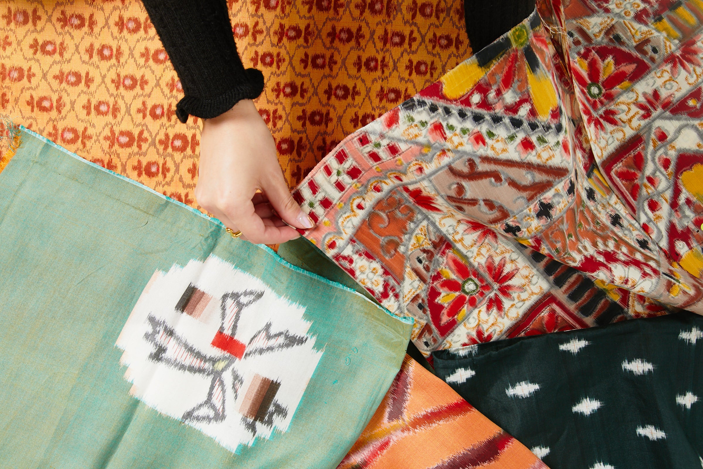 伊勢崎銘仙の最大の特徴、遊び心のあるパターンデザイン。豊かな色彩、抽象柄、幾何学模様、アートのようなデザインがあります。それらをデジタルアーカイブしながら、現代技術でテキスタイルを開発しています。